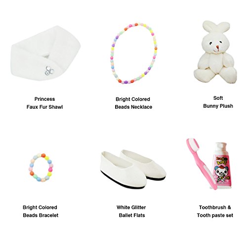 ✔ 6 Complete Outfit Sets ✔ White Glitter Ballet Flats ✔ Princess Faux Fur Shawl ✔ Bright Colored Beads Necklace ✔ Bright Colored Beads Bracelet ✔ Soft Bunny Plush ✔ Toothbrush & Paste Set TOTAL of 13 pieces you will be getting in this one SALE!