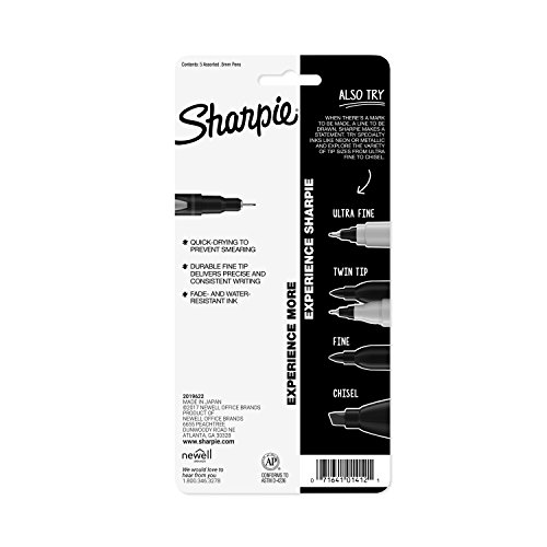 -. Feature : Color-full, brilliant shades ignite thought-provoking messages / Ink won't bleed through paper and is acid-free and archival-quality / Quick-drying ink is both water- and fade-resistant; AP certified / Fine point and slim, contoured design for effortless detail and control / Includes: black, blue, green, orange, and purple Sharpie fine point pens