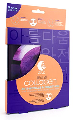 Berry Moon Korean Sheet Mask with Collagen. Collagen Sheet mask for wrinkles. Great for dry skin. With .5% Hyaluronic Acid. Contains 5 sheet mask.