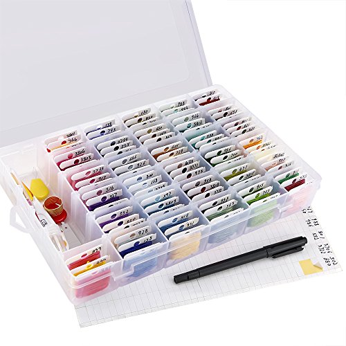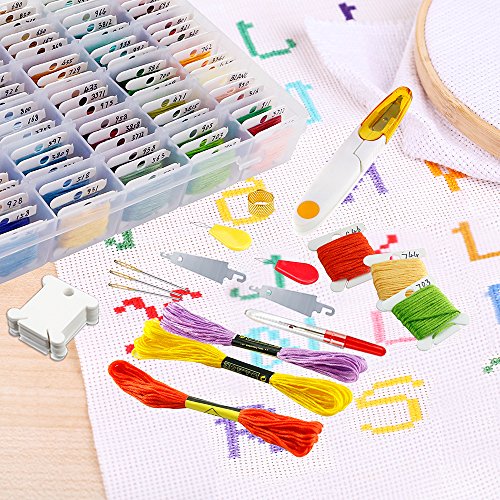 -. Feature : The set including 100 skeins embroidery threads, 1pcs Organizer Box of 32 Compartments, 100 Plastic Floss bobbins, 37pcs cross stitch kit and 480 Floss Stickers with marker pen / Material of Floss: Durable soft polyester cotton. Color:100 Colors / Keeping Organized: Including 100pcs Floss Bobbins, with them, the rest of the line can be wound around the Bobbins and keep in the Organizer Box, for the next use / Including 480 Floss Stickers with marker pen. You can write the color number on the stickers and paste it on the floss bobbins for the next use / EMBROIDERY ACCESSORIES - The cross-stitch supplies including 30 gold eye embroidery needles, 4pcs needle-threading tools, 1 pair of scissors, 1pcs untwist tool