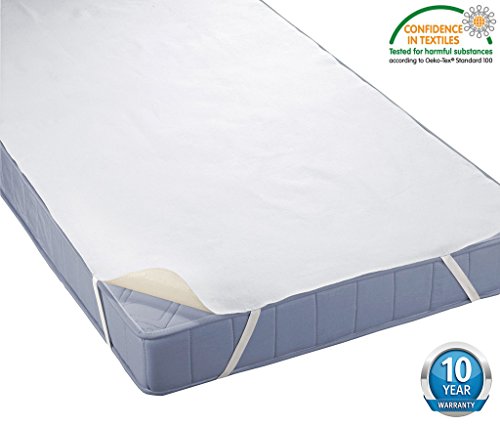 -. Feature : Material: 140g/m2 Terry material (80% Cotton and 20% Polyester) adopted on the front side and TPU on the bottom: 100% waterproof, breathable, hypoallergenic, noise free, healthy, and comfortable, suitable for any kinds of skin, including babies and sensitive persons / Having passed the verification of Oeko-Tex Standard 100, a professional and strict test for harmful substances in Textiles, safe and reliable. Effectively protect your mattress against fluids, stains, dust, mites, urine, perspiration, allergens, bacteria, etc., and keep it cleaner and more durable (10-year warranty) / Rustling and crinkling noise free TPU adopted on the bottom, ultra-silent and humanized, to help you have a sound and sweet sleeping at night / Elastic bands design on the four corners make the protector better and tightly fitted with your mattress, and not prone to slip off / Size: 28"X55"/70X140cm fit for most mattress in 8"/20cm thickness; Weight: 450g; Package: One Piece of Mattress Protector