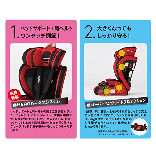 ・ヘッドサポートと肩ベルトの高さ位置調整がワンタッチ。もう、わずらわしいベルト調整は不要です。レカロ独自のHEROハーネスシステム(特許)でベルトねじれを抑制。肩から胸まで長く伸びるグリップパッドがお子様の体をしっかりホールドします。