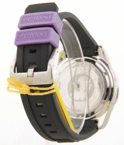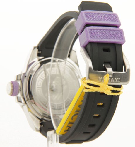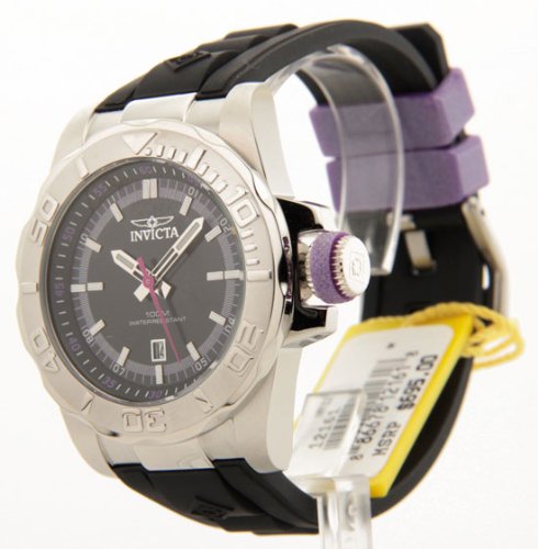 Black dial with silver tone and white hands and hour markers; metallic purple second hand; luminous; unidirectional stainless steel bezel; stainless steel crown with purple accent