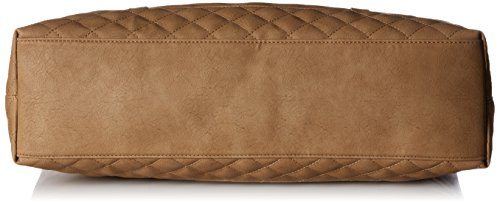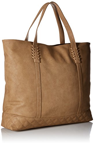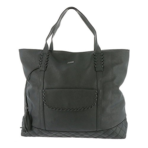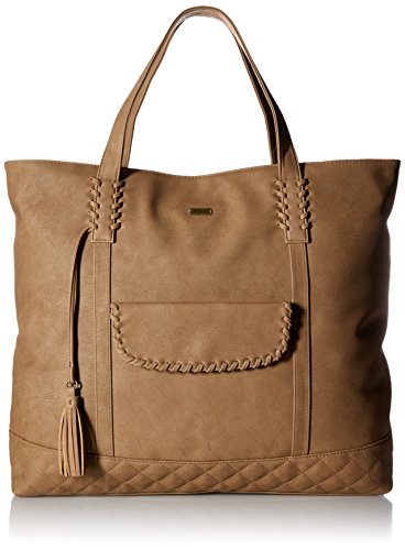 Faux-leather tote bag with zip top closure, front pocket stitching details and snap closure, inside zipper pocket, quilted stitching at bottom panel, tassel, and Roxy metal plate.