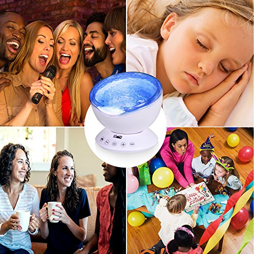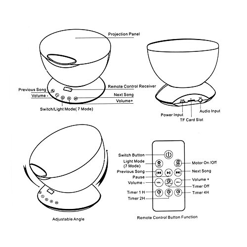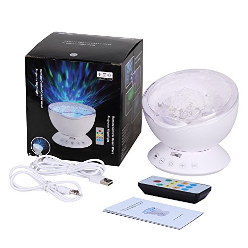 -. Feature : √ Ocean Wave Projector Night Light -- It is Hypnotic Music Lamp, Atmosphere Projector, Card Readable & Sound All-in-One Device. Creates an enjoyable and relaxing bedtime experience for children. Also perfect for adults to attain a relaxing and calming effect in the bedroom, living room, bathroom or spa. Helps drift into a calm and peaceful sleep. / √ 12 LED & 7 Color Changing Modes -- With 12 super bright LED beads, give you a beautiful sea world. 7 kinds of Blue, Red, Green, Multicolored ocean waves lighting modes covering most of the ceiling or wall, and 4 kinds soothing, comforting ocean sounds comes with the led light projector. / √ Remote Control & Timer Settings -- Can control the night light freely by the remote control, and have 1H,2H,4H timer settings, which means you'll setting the best time for it. / √ Adjustable Projection Angle -- The adjustable 45 degree tilt allows you cover the brilliant light on the whole wall or a different direction according to your needs, beautiful like the northern light. / √ Built-in Mini Speaker -- The ocean wave light projector can connect the phone, computer,MP3, notebook or insert TF Card to enjoy your favorite songs, give yourself a place to relax.