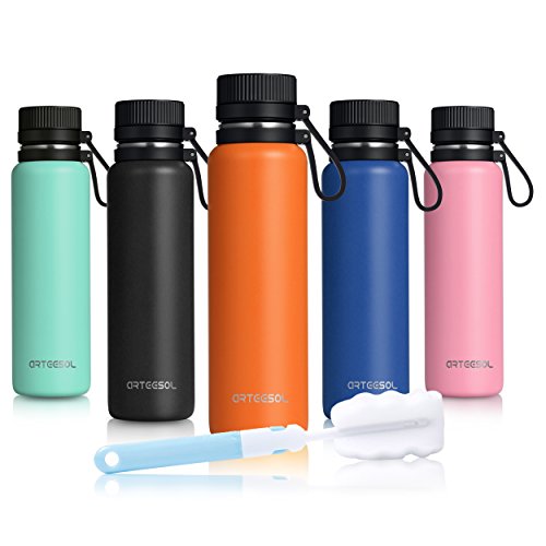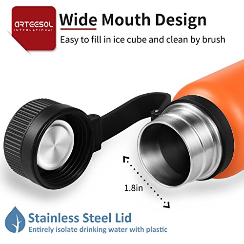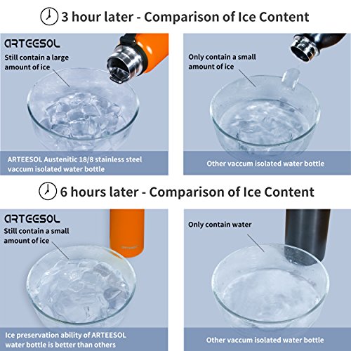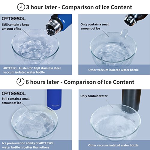 -. Feature : 🍹ECO FRIENDLY MATERIAL -- Made of premium Austenitic 18/8 stainless steel. ARTEESOL stainless steel water bottle is BPA FREE and corrosion-resistant. The food-grade material will never rust or leave a bad metal taste in your mouth. The inner lid is made of stainless steel to entirely isolate your beverage from plastic. / 🍹VACUUM INSULATED -- This double-walled water bottle will keep your drinking water icy cold or steamy hot for 12 hours. The ultra-microwave copper coated and vacuum insulation reduce the transfer of temperature. No sweating. No burning. / 🍹BEST DESIGN -- Comes with a cleaning brush. The wide mouth (1.8") water bottle makes it easy to fill water or ice and easy to clean by the brush. The rubber seal around the lid makes it an effectively leak proof water bottle. The lid is connected with a silicone hanging buckle.Flexible and portable. / 🍹LARGE CAPACITY -- The 750 ml / 25 oz insulated water bottle and 1000 ml / 34 oz vacuum flask are perfect for containing your beverage. Take it with you to office, beach, hiking, road trips, camping, gym, or anywhere you go. / 🍹LIFETIME WARRANTY -- We provide you with a lifetime warranty for Arteesol workout water bottles and 30 days no-question ask money back guarantee. If you are not completely happy with your purchase, just let us know and we will solve your problem within 24 hours.