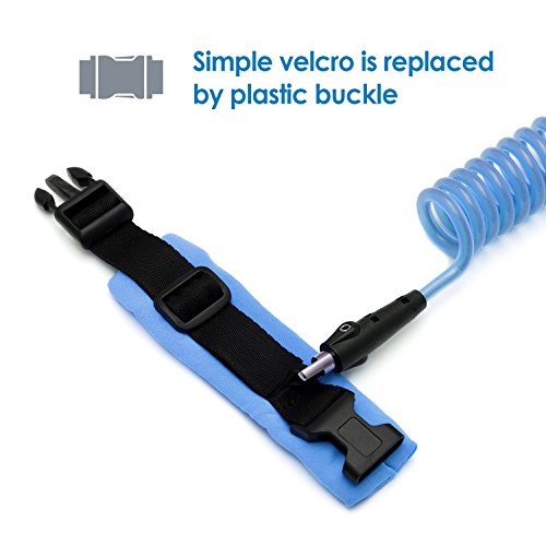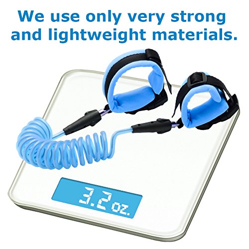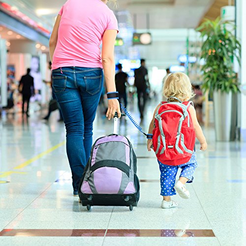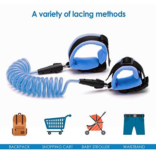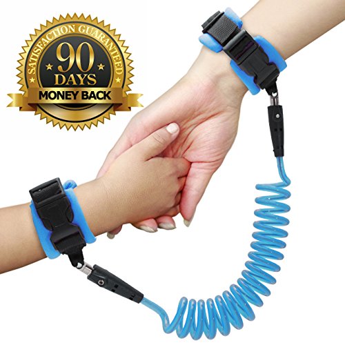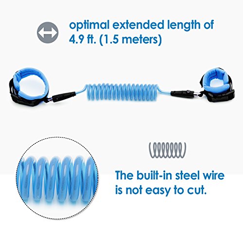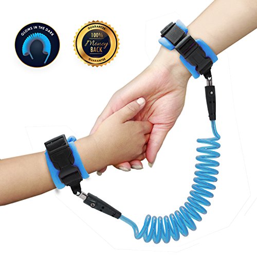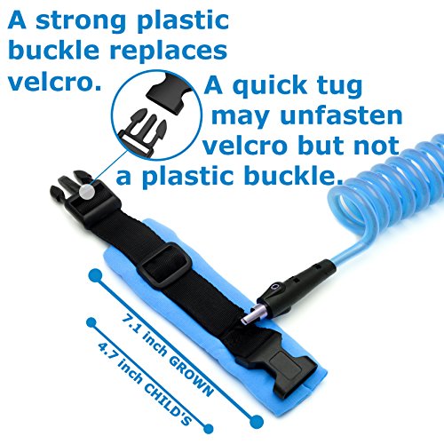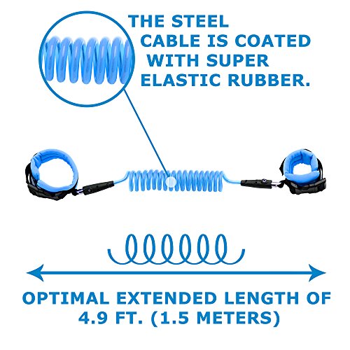 The strong wire in our child leash measures at an extended length of 4.9 feet (1.5 meters). The two comfortable wrist straps are fastened in place with a plastic buckle, which creates a more solid connection than velcro. The strong cable in our kid leash glows in the dark, providing an element of fun and an extra level of safety for your child.