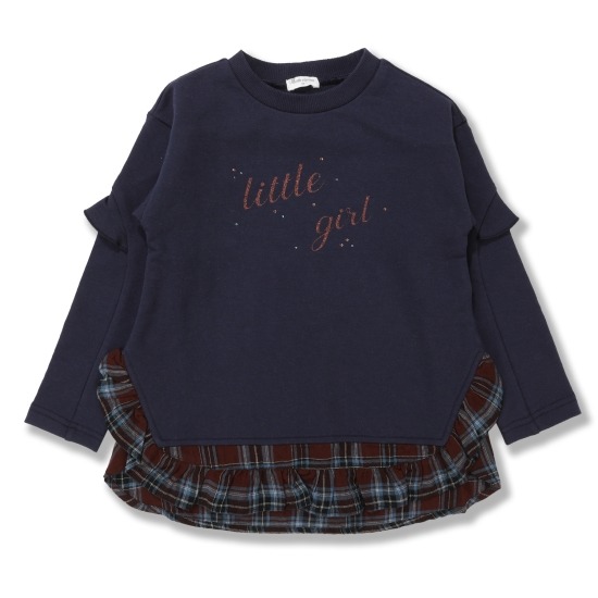 문안한 색상인 네이비에 밑단에 체크로 프릴을 달아 티셔츠를 한껏 귀여움을 더하고 앞부분에 큐빅과 등라인에도 프릴이있어 사랑스러워 보이는 티셔츠며 바지랑 엄청 잘어울리는 티셔츠입니다.