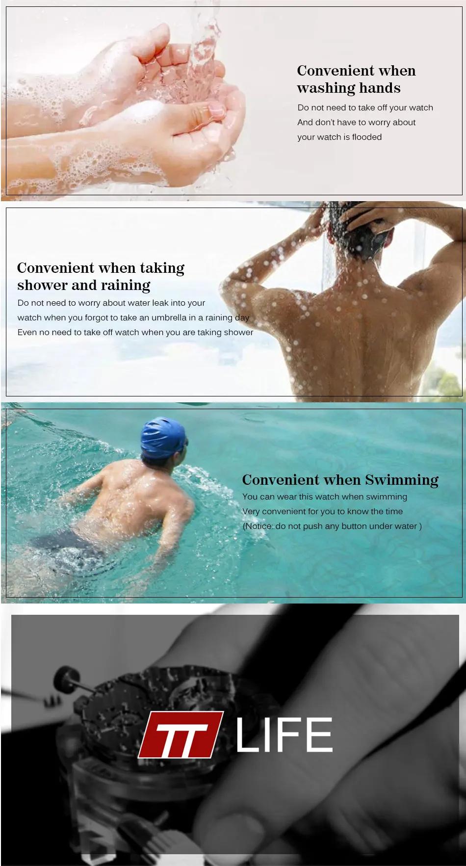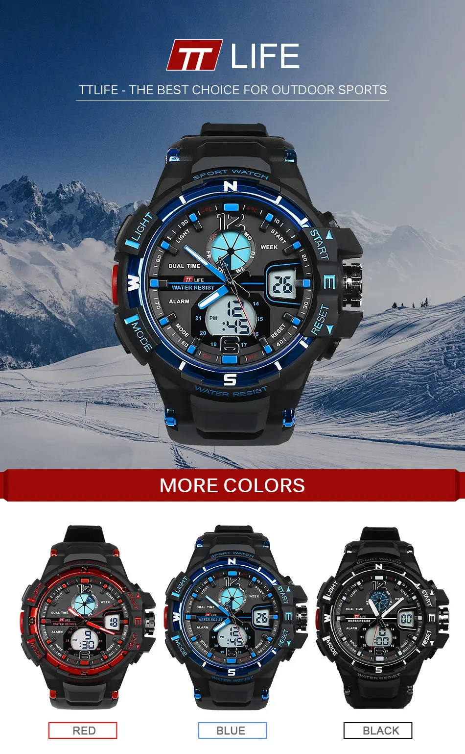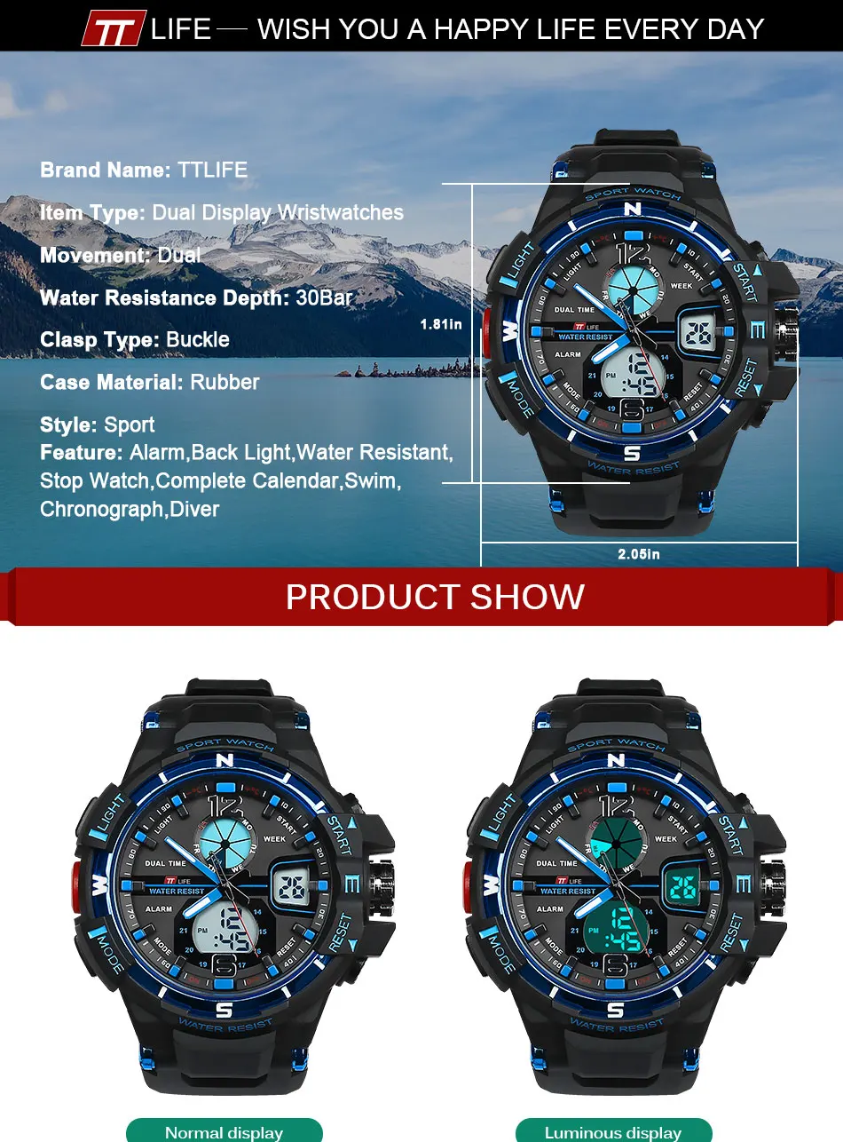 특징: 1. 수입 Acylic 크리스탈 수 폭발 및 고화질. 2. Matel 크라운 더 느낌 긴 수명 3. 일본 원래 설치 수입 Maxcell 배터리, 꾸준한 제공 에너지 운동 에너지 4.304 스테인레스 스틸 강화 나사 5.30 메터 방수-스테인레스 스틸 시계 더 방수 기능 다시 나사 제공합니다. 6. 수입 PU 수지 스트랩-수입 수지 재료, 스트랩 부드러운 편안하고 환경 보존. 사양: 브랜드 이름: TTLIFE 색상: 블랙/레드/블루 항목 유형: 석영 손목 물 저항 깊이: 3Bar 케이스 모양: 라운드 특징: 방수, 충격 방지, 정지 시계, 달력, 여러 시간대, 자동 날짜, LED 디스플레이 스타일: 패션 & 캐주얼 밴드 재질: 플라스틱 케이스 두께: 14 미리메터 직경 다이얼: 52 미리메터 걸쇠 유형: 버클 운동: 석영 케이스 재질: 수지 밴드 폭: 24 미리메터 성별: 남성 다이얼 창 소재 유형: Hardlex 패키지 포함 1×Brand 새로운 TTLIFE 시계 1×User 설명서 (영어) FAQ (자주 묻는 질문) 당신의 지원 고급! 포장 상세
