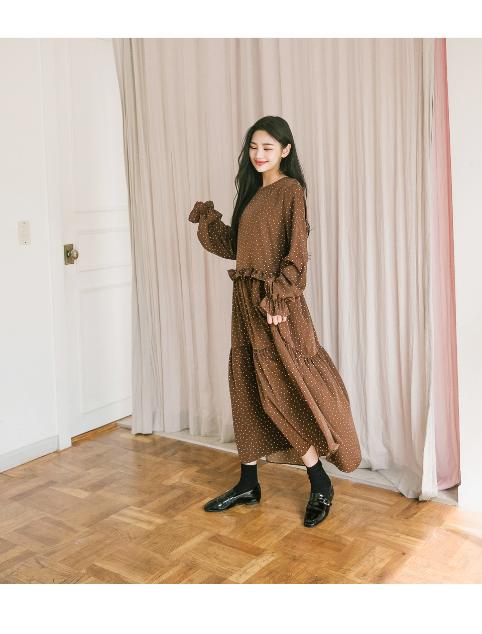 러블리한 무드의 도트패턴과 소매와 허리 프릴 디테일이
