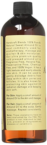 - 100% PURE & NATURAL SWEET ALMOND OIL is most commonly used for aromatherapy, massage and as a hair & skin moisturizer. Our premium quality almond oil Fragrance Free, Hexane Free, Preservative Free, Chemical Free, and 100% Vegan.