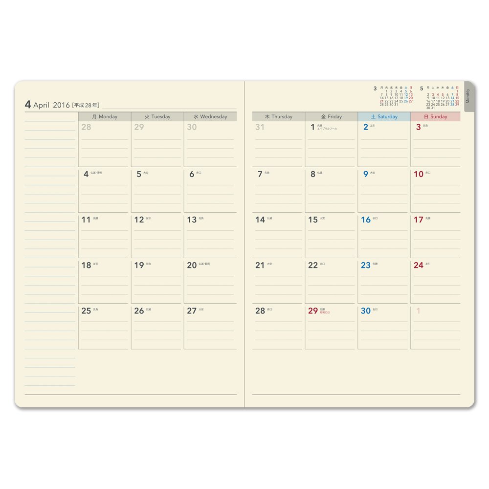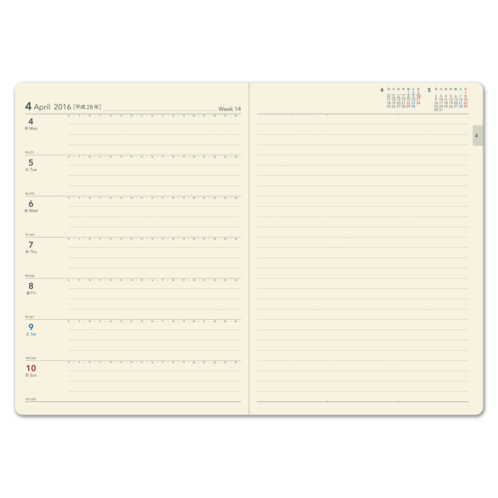 I usually use the maternal system notebook, but I use this notebook as a basic private center. It is A5 size so it is easy to use widely filling in the space appropriately. The ruled line page is abundant, and it is perfect for me that I write often. Speaking of greed, I would like to write a little more of the monthly block part. Would not it be easier to write if you put one line in the middle and you did top in the morning and bottom in the afternoon? Both the cover and the pattern have a luxurious feeling, and I think that it is a NOLTY product, as it is solidly bound. You can also write and taste good. Vertical type, so it is very nice because you can see the weekly free time instantly. May the cover color have more variation? Also, since it has only the beginning of April, I think that there may be a beginning in January.