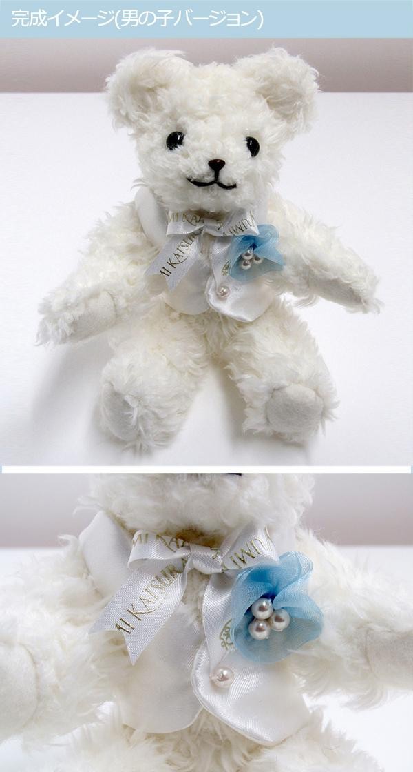 ご家族と一緒に結婚式を挙げる際に、ウェルカムベアカップル(別売り)と一緒に飾れる子供のベア1体分のキットです。洋服の作り方、リボンと花の付け位置によって、男の子か女の子のどちらかを選んでお作り頂けます。ぬいぐるみ生地はカット済みです。 |