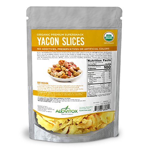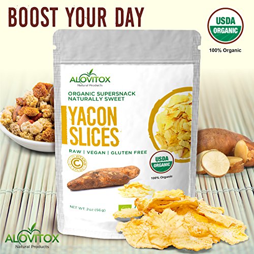 -. Feature : DELICIOUS SUPERNACK Trying to cut down on sugar and looking for a sweet alternative to add to all the foods you love? You can count on Alovitox yacon root slices to provide a flavor that you cannot resist! Pure yacon slices are a snack that might help with weight loss and candida. / NUTRITIONAL PROPERTIES Certified organic, Non-GMO, raw Gluten-free and Vegan Fat Free. No Additives, No preservatives, No Artificial colors, a non-irradiated product, fiber, ghrelin, FSO, gastric emptying, waistline diet support / VITAMINS & NUTRIENTS This Superfood contains high levels of Protein, Fiber, Vitamins B & C, Calcium, Iron, Copper, Potassium, Manganese, and Fatty Acids. / PREBIOTIC EFFECTS With high levels of FOS, this high glucose snacks aids digestion by feeding healthy bacteria in digestive system and protecting against illnesses caused by toxic bacteria. It can absorb toxins. This zero calorie gluten free sugar substitute helps maintain healthy blood pressure, cholesterol levels, blood sugar levels and regulates blood flow. / WELLNESS AND WEIGHT LOSS AID Known as the "Diet Potato", this raw vegan snack contains high levels of FOS Prebiotics which make you feel full for longer periods of time. It may help with weight loss and improve digestion. A perfect, sweet snack with similar flavor to molasses and maple syrup.