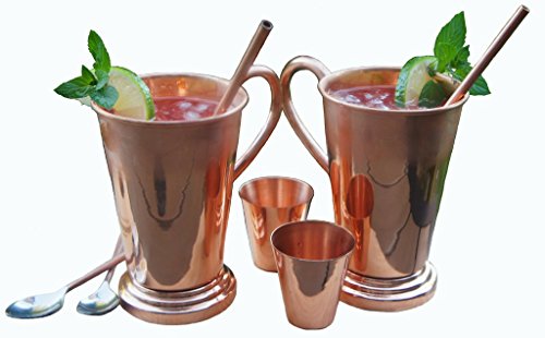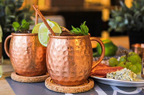 COMPLETE SET - Each set of classic copper mugs comes paired with (2) shot glass, two (2) muddler spoons, two (2) straws, two (2) cork coasters, and one (1) mixology book.