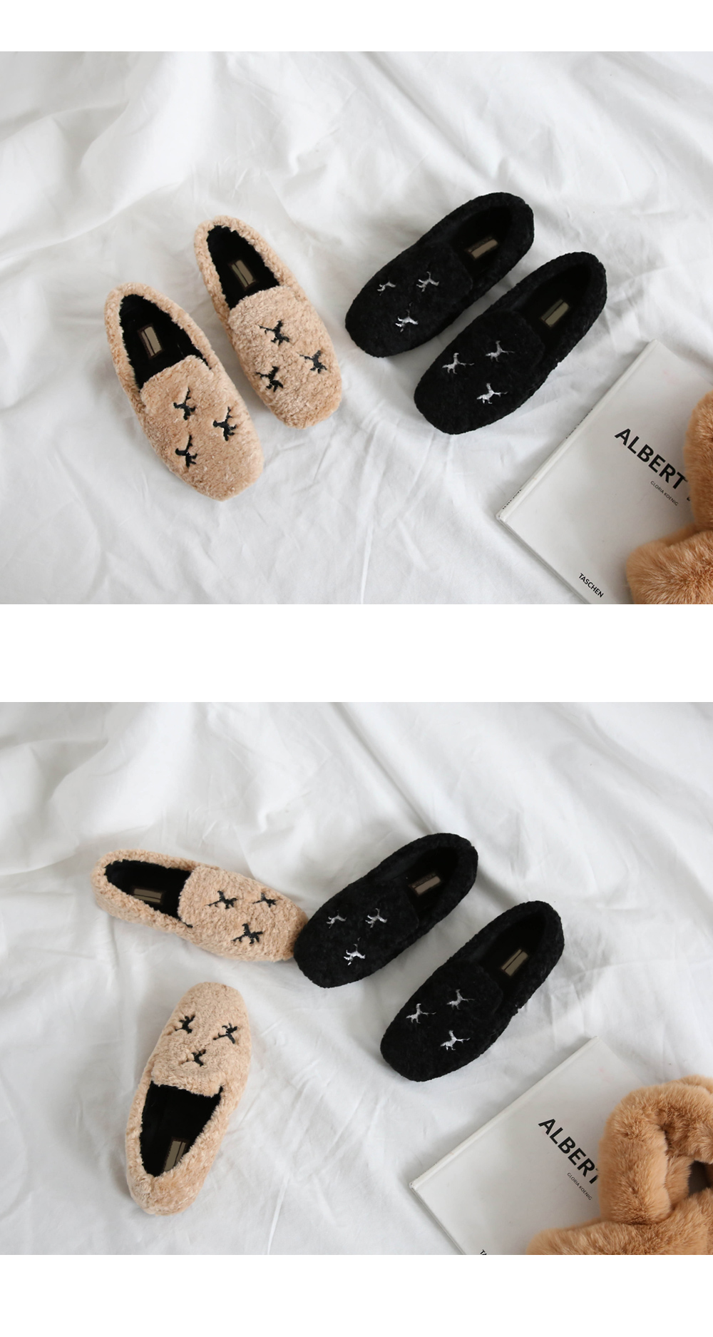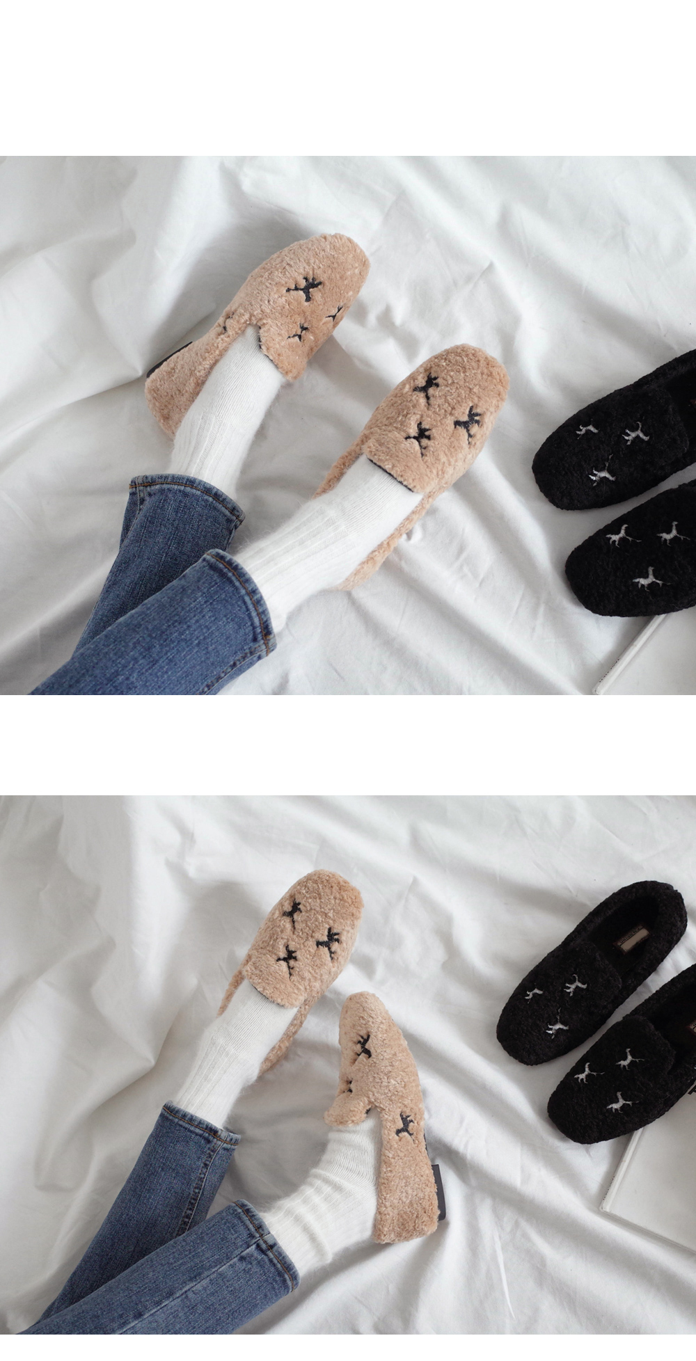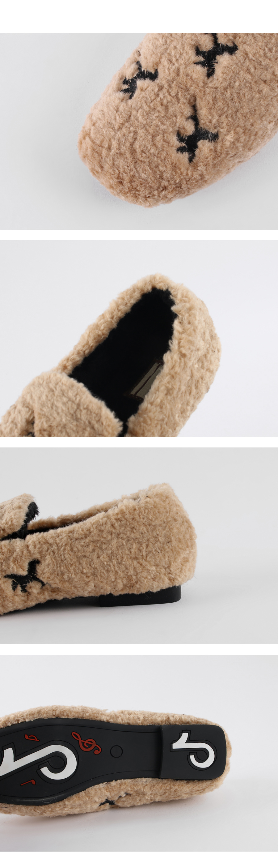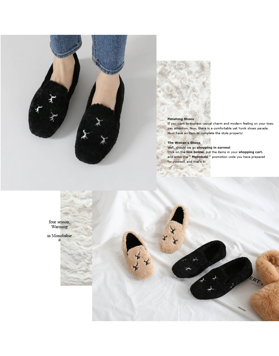 DETAILS - 소재 : 인조양털 - 안감 : 기모안감 - 컬러 : beige,black - 피팅감 : 정사이즈 / 무게 : 보통인편 - 착화감 : 편해서 데일리 슈즈로 좋아요 - 모델피팅 : 230(36)