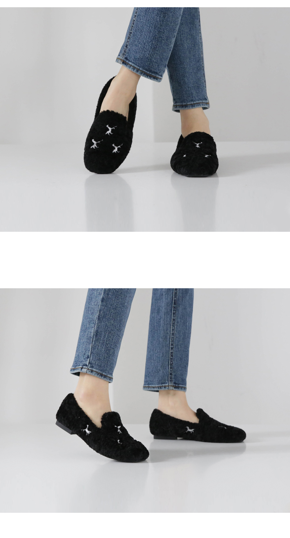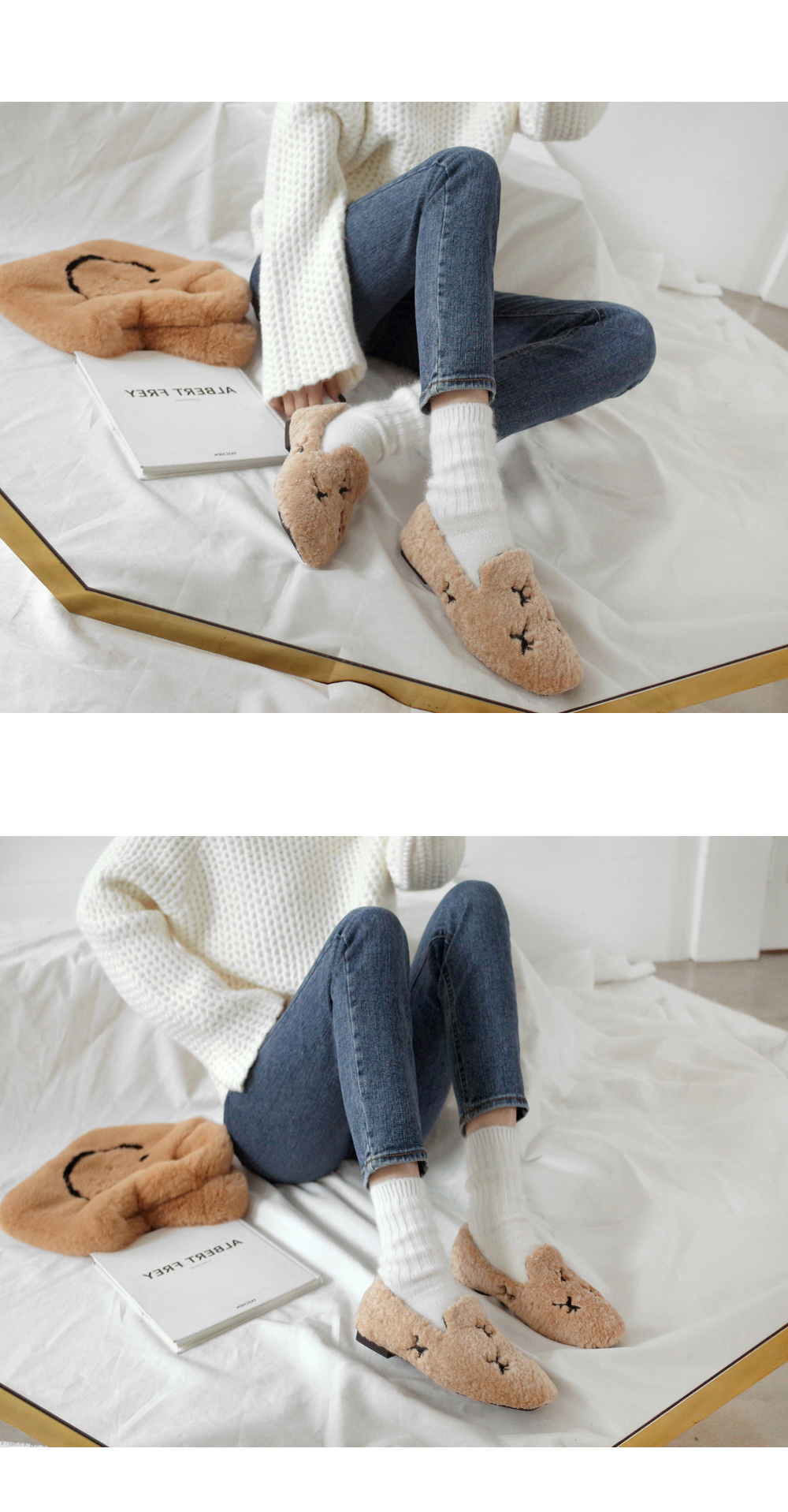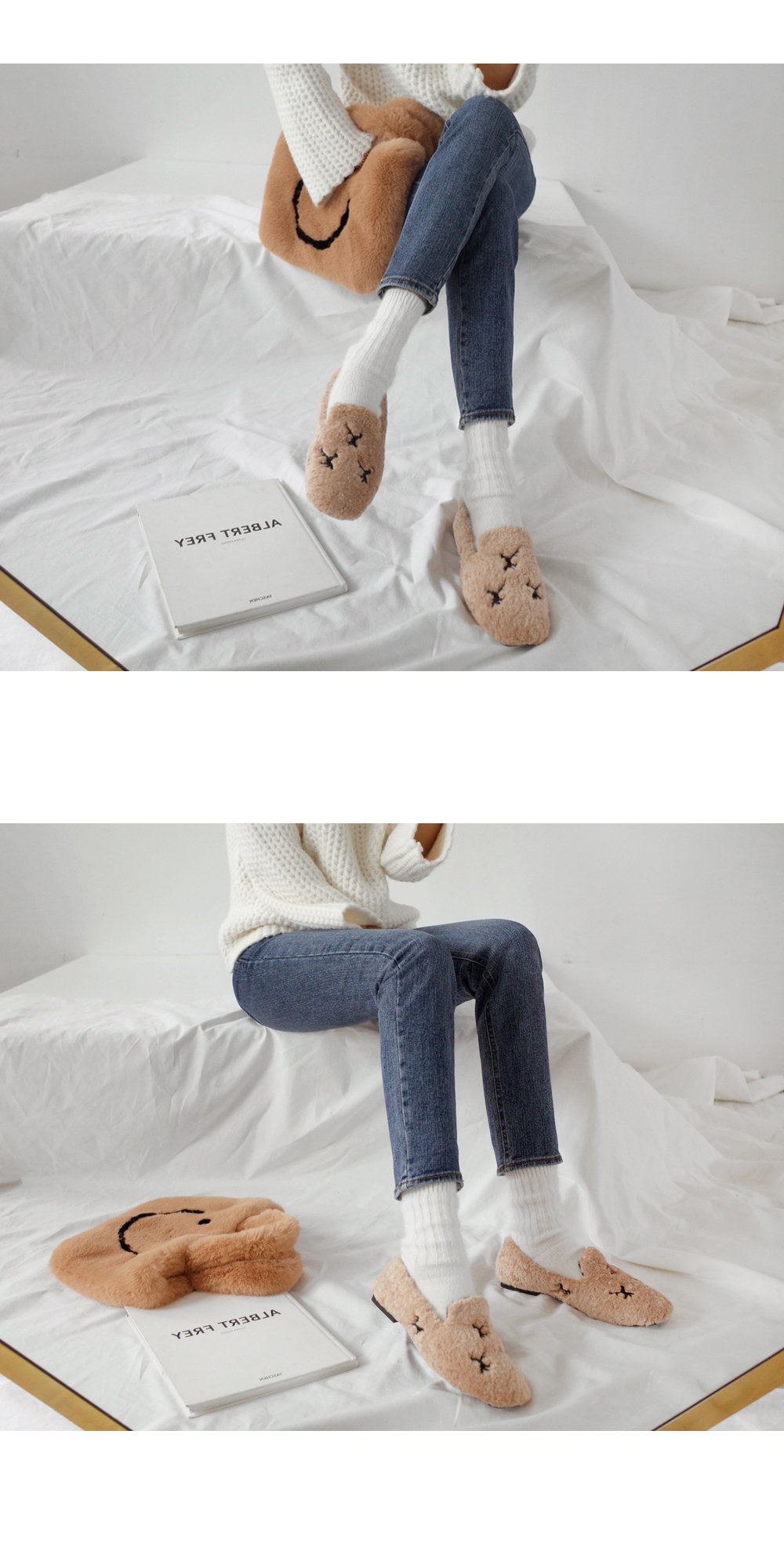 DETAILS - 소재 : 인조양털 - 안감 : 기모안감 - 컬러 : beige,black - 피팅감 : 정사이즈 / 무게 : 보통인편 - 착화감 : 편해서 데일리 슈즈로 좋아요 - 모델피팅 : 230(36)