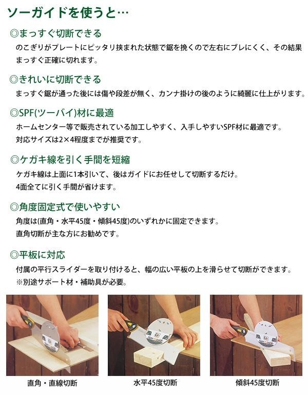 | ソーガイドは、木材を正確に切断する為の「のこぎり補助道具」です。ガイドプレートは直角、水平45度および傾斜45度のいずれかに固定できます。 角度固定式で使いやすく、2×4等の大きな材料や平板もまっすぐ、きれいに切断できます。 |