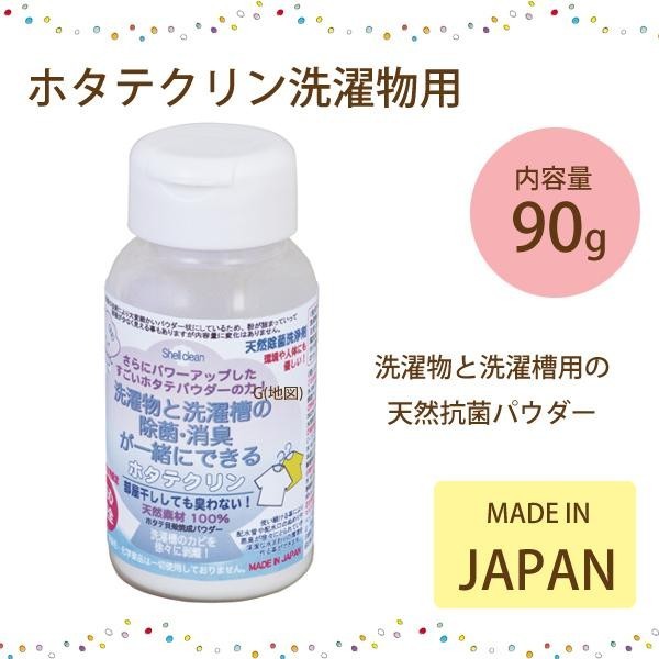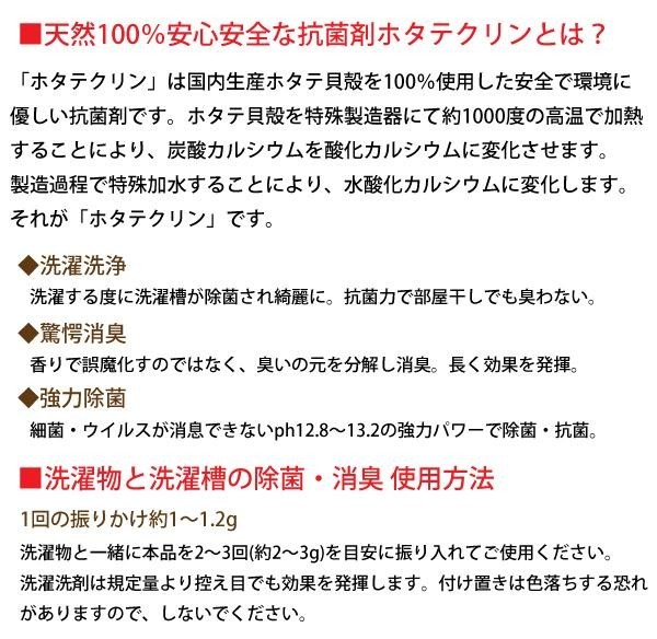 洗濯物と洗濯槽の除菌、消臭が一緒にできます。国内生産ホタテ貝殻を100%使用した環境にやさしい抗菌剤です。簡単な扱いで手軽に使用可能です。 |