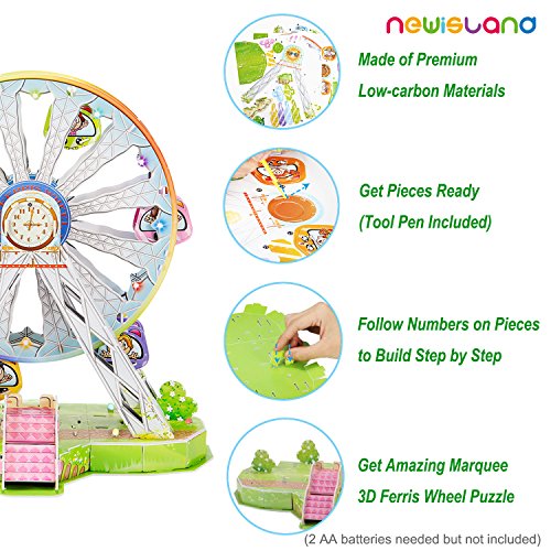Product Features ?3D Jigsaw Puzzles provide more fun than those traditional floor puzzles, also create good communication opportunity for family members. ?The puzzle game is full of fun challenges and educational, clear detailed instructions included. ?Finally when turn it on, a ferris wheel park show up in shinning LED lights marquee and couples of popular rhymes! Worried-free Service If you have any question, please feel free to contact us with your #order ID at support@inewisland.com
