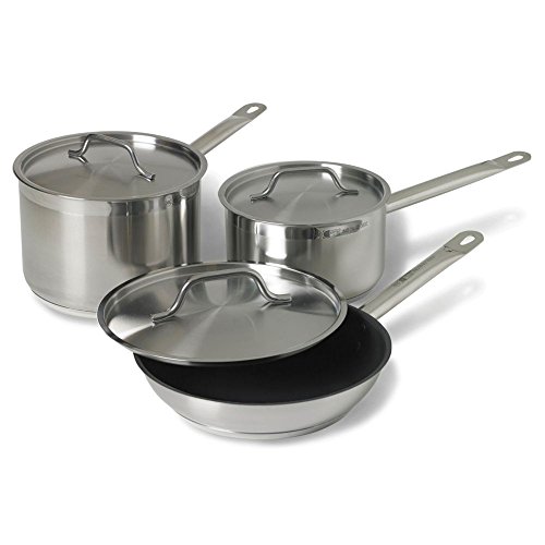 -. Feature : Deluxe Optio cookware set is made of stainless steel material / Brushed stainless steel surface distributes heat quickly / Bottom is protected by a thin wafer of stainless steel to prevent denting and scratching / Aluminum-clad bottom for quick and even heat distribution and an economy line designed for lighter duty cooking / Includes 2.75-quart sauce pan with lid, 4-quart sauce pan with lid and 9-1/2-inch non-stick fry pan with stainless steel lid