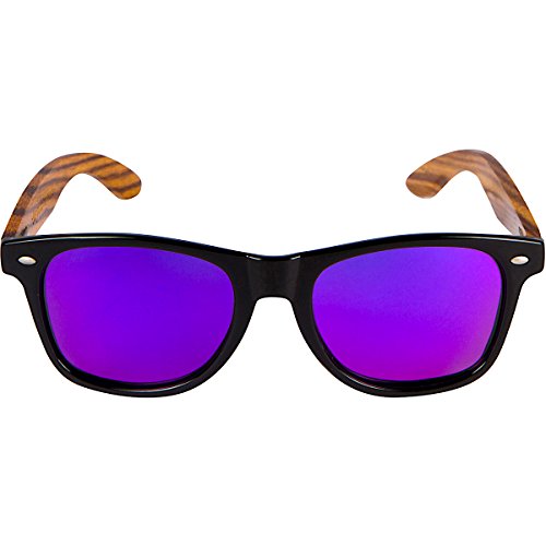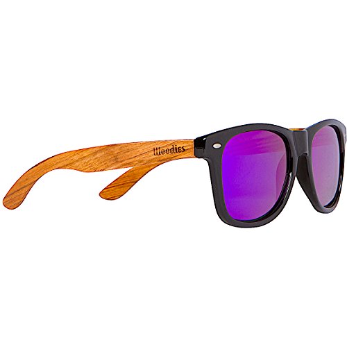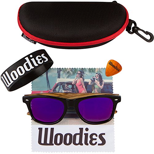 -. Brand : Woodies -. Color : Black -. Department : unisex-adult -. EAN : 0610256534671 -. Feature : Handmade from REAL Zebra Wood (50% Lighter than Ray-Bans) / Includes FREE Carrying Case, Lens Cloth, and Wood Guitar Pick / Polarized Lenses Provide 100% UVA/UVB Protection / 30-Day Money Back Guarantee / A GIFT FROM THE CAPTAIN: Buy Any Two Woodies Products, Save 20% Automatically! -. PackageQuantity : 1 -. ProductGroup : Apparel -. ProductTypeName : EYEWEAR -. Size : Medium -. Title : WOODIES Zebra Wood Sunglasses with Purple Mirror Lens -. UPC : 610256534671