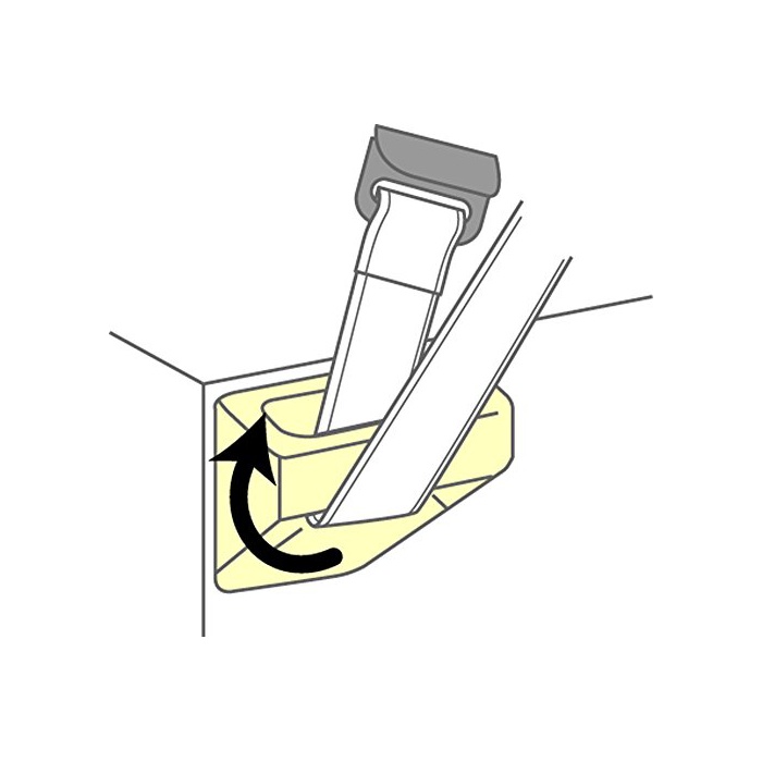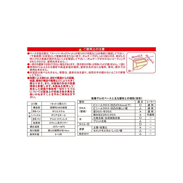 소재 재질:구조부/고강성ABS수지,특수 밴드/폴리에스텔,버클/폴리《아세타루》,금구 나사/알루미늄 스테인레스,금구B/도장 강판,나사/철(유니크로 도금)고, 점착부/《스치렌》계 중합체