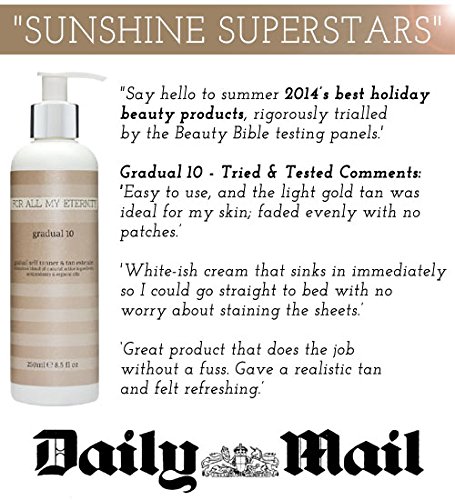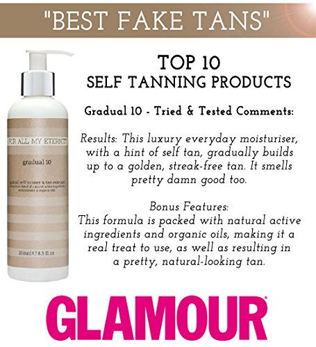For All My Eternity Gradual 10 - a natural luxury everyday moisturizer with a hint of For All My Eternity's legendary self tan. Combining significant skincare benefits with a healthy glow, this easily absorbed, non-sticky formulation is loaded with the finest natural active ingredients and antioxidants, including Aloe Vera, Cocoa Butter, Vitamins A & E, and infused with organic ingredients such as Rosehip Oil, Sunflower Oil and Sweet Almond Oil which all work beautifully together to help transform and care for your skin in 10 different ways. 1. Moisturizes 2. Nourishes 3. Protects 4. Softens 5. Smoothes 6. Soothes 7. Evens Out Skin Tones 8. Delays the Effects of Ageing 9. Improves Skin Elasticity and Firmness 10. Develops Gradually into a Flawless Tan. For All My Eternity Gradual 10 is a quick-drying, daily self tanning lotion which gently cares for your skin, transforming it from zero to hero with minimum fuss. Suitable for face and body, simply swathe yourself in this luxurious lotion every day for soft, subtle, sun-kissed radiance or to enhance and extend your existing tan. Gradually build up a natural-looking, streak-free tan and control the level of colour that is right for your individual skin tones. Gradual 10 offers you all the benefits of a luxury daily moisturiser whilst also giving your skin a subtle, healthy sun-kissed glow.The perfect accompaniment to existing For All My Eternity tanning mousses and sprays, Gradual 10 also uses the same time-tested blend of natural ingredients which helps minimise any odours associated with self tanning without the need of adding unnecessary chemicals to lock out the odour.Feature