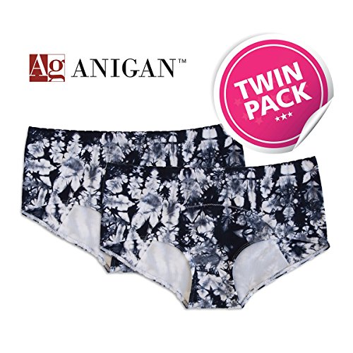 -. Brand : Anigan -. Department : womens -. Feature : Great protection for women and girls during their menstrual cycle. Great for light incontinence and postpartum. Our Leakproof Protection Makes You Worry-Free! / Tagless, no more scratchy label / Nylon / Spandex / Machine Washable; US designer and Seller / Waist Size: Medium: 24-26"; Large: 27-28.5"; XLarge: 29 -30.5"; XXL: 31-32.5" -. ProductGroup : Apparel -. ProductTypeName : APPAREL -. Title : Anigan StainFree 2 Pack Seamless Boyshort Tie Dyed Menstrual Period Panty - Black - L
