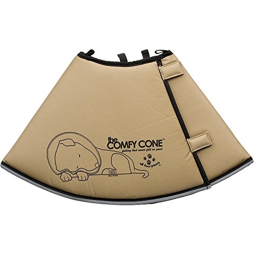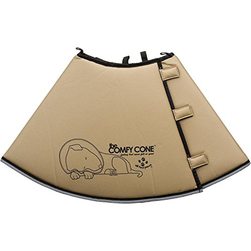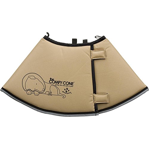 Comfy Cone is a soft cone shaped e-collar which is Veterinary tested and approved for cats and dogs and is made of foam backed nylon and comes in 4 sizes and in black or tan. Has Velcro closures that adjusts to many different sizes. Is water resistant and repellent and easy to wipe clean. Has elastic loops at neck to thread pets collar through to keep from being pulled off. Can be folded back for added freedom while eating and drinking or when checking wounds and irratations. Has a reflective outer edge for safety when walking at night. Is reversible and folds flat for easy storage. Is soft and yielding while being very sturdy and protective.Sizing Chart