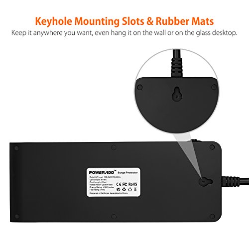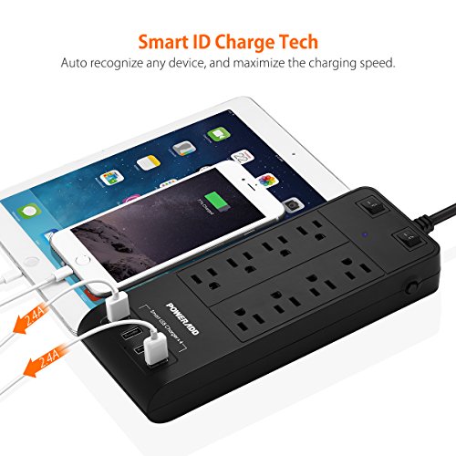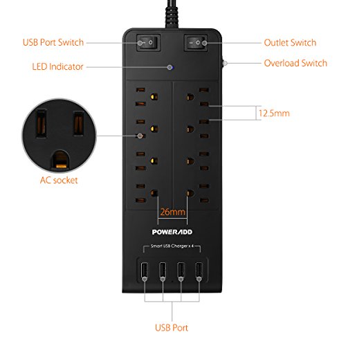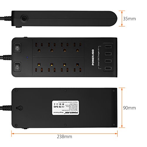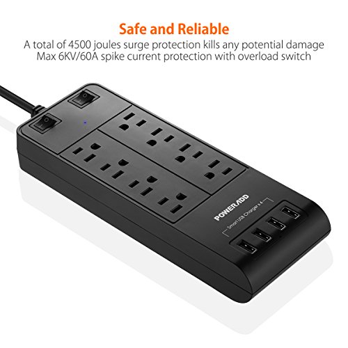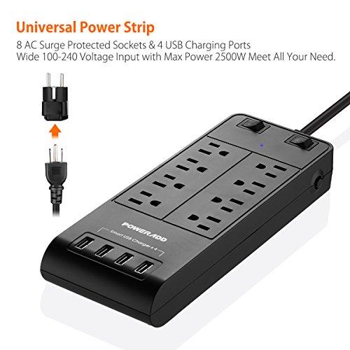 Poweradd 8-Outlet Surge Protector 4500 Joules Universal 100-240V Power Strip with 4-Ports Smart USB (Max 5A) for Laptop, Hair Dryer, Cellphone, Tablets and More