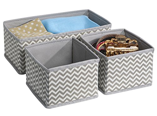 Studio : InterDesign Publisher : InterDesign Binding : Misc. Product Description InterDesign's Chevron Fabric Storage collection is functional and stylish. This 3 Piece Dresser Drawer Organizer Set is perfect for storing scarves, socks, undergarments, accessories, and much more! It can be used for inside the drawer, but it's stylish enough for your dresser top! 0