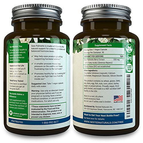 -. Feature : LOVE OUR SAW PALMETTO, OR YOUR MONEY BACK | Hello, we're Nested Naturals. Nice to meet you! We're a socially conscious company that believes in only using the the best, most ethically produced ingredients available, 3rd party testing every batch and donating to charity to make the world a better place. We stand behind this pledge with our Lifetime Guarantee. If you're not happy with your purchase, simply call or email us. / QUALITY YOU CAN TRUST: We are relentless in sourcing the BEST QUALITY, and MOST NATURAL ingredients around. Grinding up the Saw Palmetto berries into powder form yields very little of the active ingredients. We use 320 mg of STANDARDIZED EXTRACTS rich in sterols that can be TESTED FOR PURITY AND POTENCY in each capsule. Many prostate health supplements on the market use less effective powdered formulas because they are cheaper to produce - SO CHECK YOUR LABELS CAREFULLY! / SUPPORT A HEALTHY PROSTATE & REDUCE FREQUENT URINATION: In our bodies, the hormone DHT signals the prostate to grow, causing frequent urination, difficulty urinating and even dribbling as men age. Less DHT means a slower prostate growth and more room for the urethra. Studies have reported decreased urinary symp in participants that take Saw Palmetto. / PROMOTE HAIR RETENTION & FIGHT HAIR LOSS, NATURALLY: Excess DHT causes hair follicles to shrink with age, which translates to LESS hair growth and a shorter life span for each hair. Research sests that Saw Palmetto's DHT-decreasing powers may help INCREASE hair density and naturally promote hair retention in both men and women. / A PROMISE OF QUALITY & CARE: Nested Naturals Saw Palmetto is 100% NON-GMO CERTIFIED GLUTEN FREE, and sustainably sourced. It is also ALLERGY-FRIENDLY and contains NO barley, yeast, sugar, dairy, soy, eggs, nuts, corn OR preservatives. On top of that, EVERY purchase you make improves the nutrition of a woman or child in need through our partnership with Vitamin Angels. All of our products also come with a rare LIFETIME GUARANTEE. There's no hitch. Just email or call our Customer Care Team.