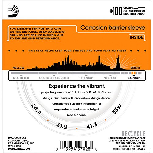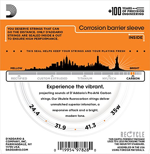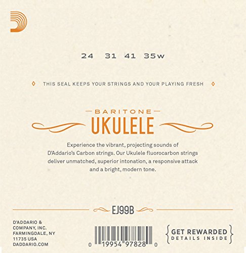 Studio : D'Addario Co. Inc Publisher : D'Addario Co. Inc Binding : Electronics Product Description D'Addario EJ99B strings are designed specifically for baritone ukuleles. The 4th string is a silver-plated copper wound on nylon complimented by a 1st, 2nd and 3rd strings utilizing our exclusive Pro-Arte' Carbon material. This set is optimized for usage with standard DGBE tuning. Pro-Arte Carbon Ukulele strings are designed for the perfect blend of tone and projection. These fluorocarbon sets are ideal for progressive ukulele players looking for a bright, modern sound. 0