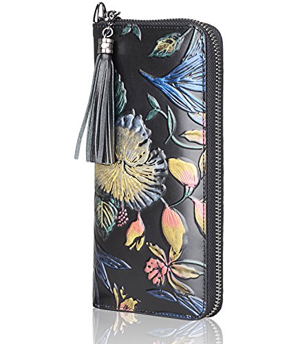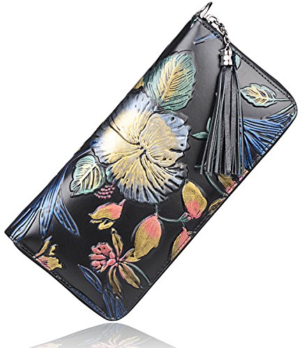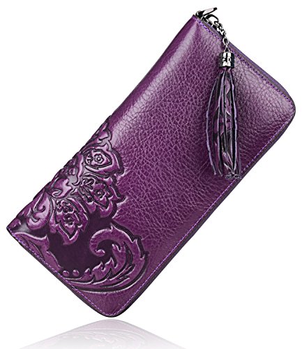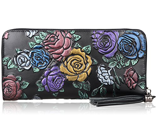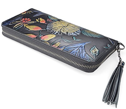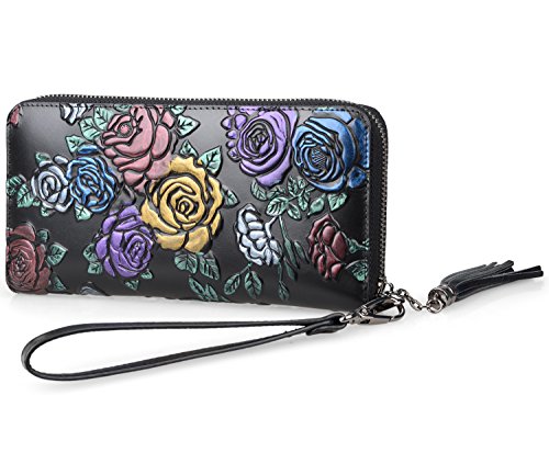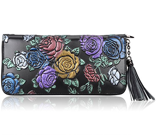 -. Feature : 100% genuine leather with embossed floral; / fabric lining; / zipper closure; / Size: L8"x H4" xW 0.8" ; with a 8" leather strap; weight: 0.21 kg / Interior Details: Inside 1 Zip Pocket, 2 bill compartments, 8 Card slots