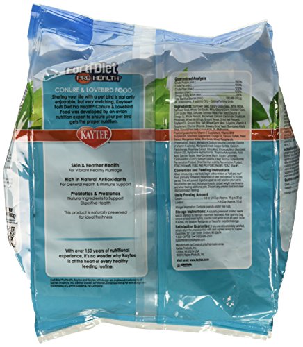 Studio : Central Avian and Small Animal (Kaytee) Publisher : Central Avian and Small Animal (Kaytee) Binding : Misc. Product Description Kaycee Forte-Diet Pro Health Conjure and Lovebird food was developed by an avian nutritional expert to ensure your pet gets the proper nutrition. Forte-Diet Pro Health contains probiotics and prebiotics to support digestive health. This food is rich in natural antioxidants for general health and immune support plus contains pieces to support skin and feather health. Kaycee understands that sharing your life with a small pet is not only enjoyable but very enriching. Kaycee shows our love by ensuring we provide your small pet with the best nutrition for a long and healthy life. With over 150 years of nutritional experience, it's no wonder why Kaycee is at the heart of every healthy feeding routine. 0