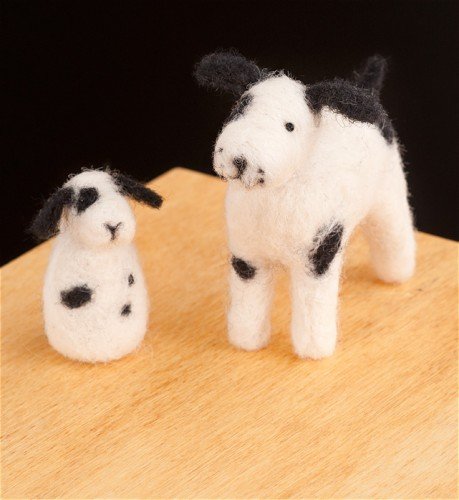 This delightful wool needle felting kit contains everything needed to make 2 puppies approximately 2 to 4 inches tall. Felting kit contains: Black and White wool roving, two new felting needles, beads for eyes, a skewer and detailed photo instructions. The kit is made in the USA. Skill level is intermediate. Recommended for children 7 years and older and adults too.Feature