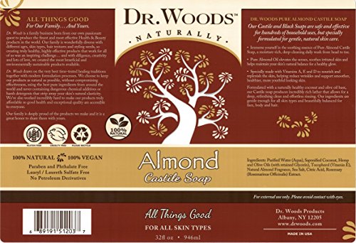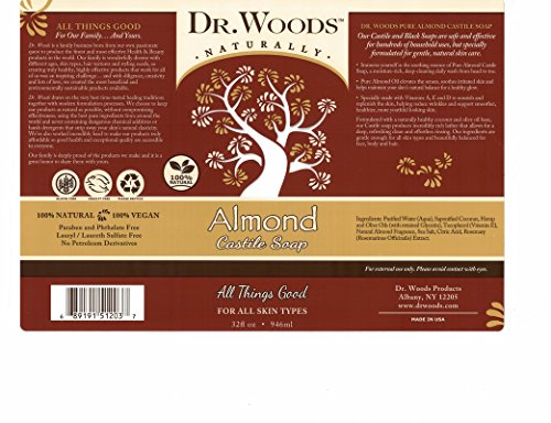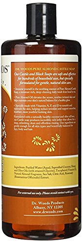 Studio : Dr. Woods Publisher : Dr. Woods Binding : Misc. Product Description Original Castile Soap Pure Almond by Dr. Woods 32 oz Liquid Original Castile Soap Pure Almond Dr. Woods Castile Soap is very mild and versatile for everyday as a body wash facial cleanser shampoo and shaving lather. It is also excellent as a mild laundry detergent. There are three refreshing fragrances Peppermint Almond and Tea Tree. Originating from Castile Spain our soaps are vegetable based containing no animal fat. Because our soaps are biodegradable they are perfect for camping. Castile Soap incorporates the natural healing properties of olive oil with an invigorating scent. The olive oil in our soaps attracts moisture and while holding that moisture close to the skin forms a breathable layer preventing the loss of that moisture. Dr. Woods Castile Soap does not contain any harsh detergents that can strip away skin s natural moisture. The fragrance refreshes and reinvigorates your skin and senses after a long hectic day while the Vitamin E rich lather leaves skin feeling naturally 0
