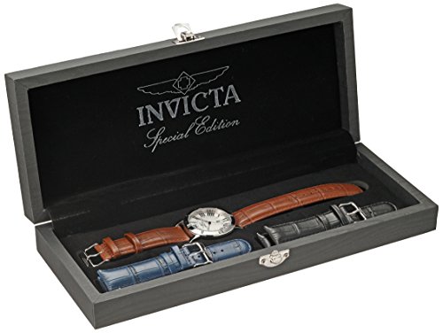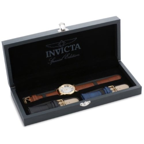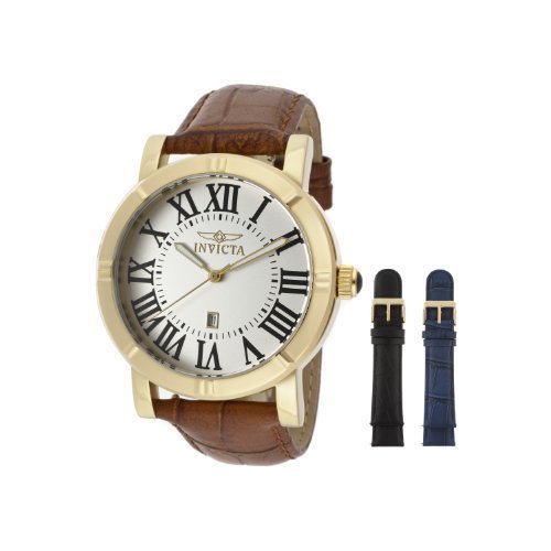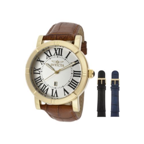 ReleaseDate : 2012-09-21 Studio : Invicta Publisher : Invicta Binding : Watch Product Description 18kt gold-plated stainless steel case with a brown leather strap. Fixed 18kt gold-plated bezel. Silver dial with luminous gold-tone hands and Roman numeral hour markers. Minute markers around an inner ring. Dial Type: Analog. Luminescent hands. Date display above the 6 o'clock position. Quartz movement. Scratch resistant flame fusion crystal. Pull / push crown set with a blue cabochon. Solid case back. Case diameter: 42 mm. Case thickness: 12 mm. Round case shape. Band width: 22 mm. Band length: 7.85 inches. Tang clasp. Water resistant at 100 meters / 330 feet. Functions: date, hour, minute, second. Additional Info: additional interchangeable black and blue leather straps included. Casual watch style. Invicta Specialty Silver Dial Brown Leather Mens Watch 13971. 0