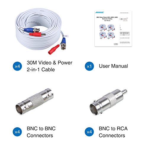 Part Number:XCL038 Item Weight:4.95 pounds Product Dimensions:9.5 x 5 x 4 inches Item model number:XCL038 Size:100 Feet Color:White Style:4pcs 100ft Cable-White Pattern:4pcs 100ft(White) Item Package Quantity:1 Included Components:2 pack outlet covers Batteries Included?:No Batteries Required?:No Warranty Description:Three Years Warranty. ASIN:B00SY4V7T2 Customer Reviews:4.3 out of 5 stars 303 customer reviews 4.3 out of 5 stars Best Sellers Rank:#1 in Electronics > Camera & Photo > Video Surveillance > Surveillance Accessories > Surveillance Camera Cables #8 in Electronics > Security & Surveillance > Accessories Shipping Weight:5.2 pounds (View shipping rates and policies) Date First Available:January 30, 2015