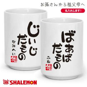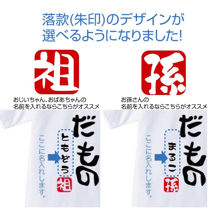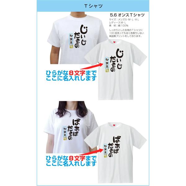 敬老の日やご長寿のお祝いに!「じいじだもの」「ばあばだもの」名入れtシャツです。 ※2枚セットではありません! もちろん高品質でしっかりとした厚手生地5.6オンスのTシャツがベースで品質に自信ありです。しかも、この価格でお名前を名入れします!! 名入れ文字の書体は筆文字となります。文字数は8文字まで名入れいたします。