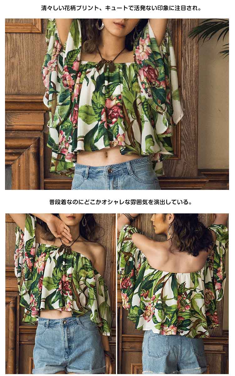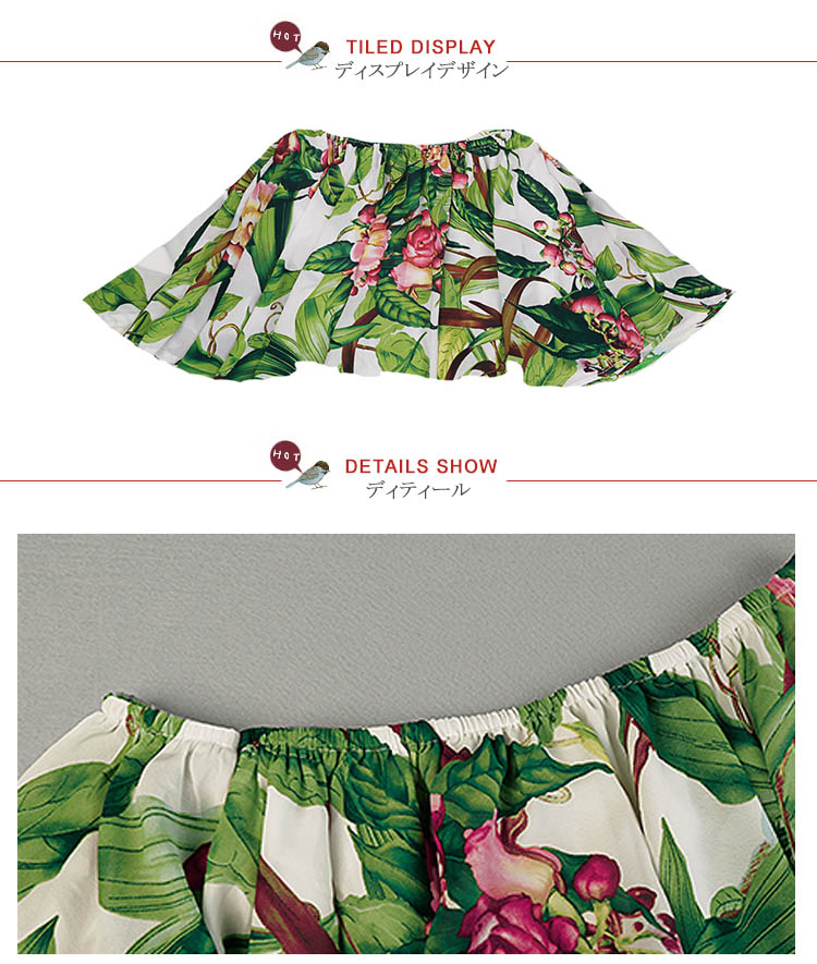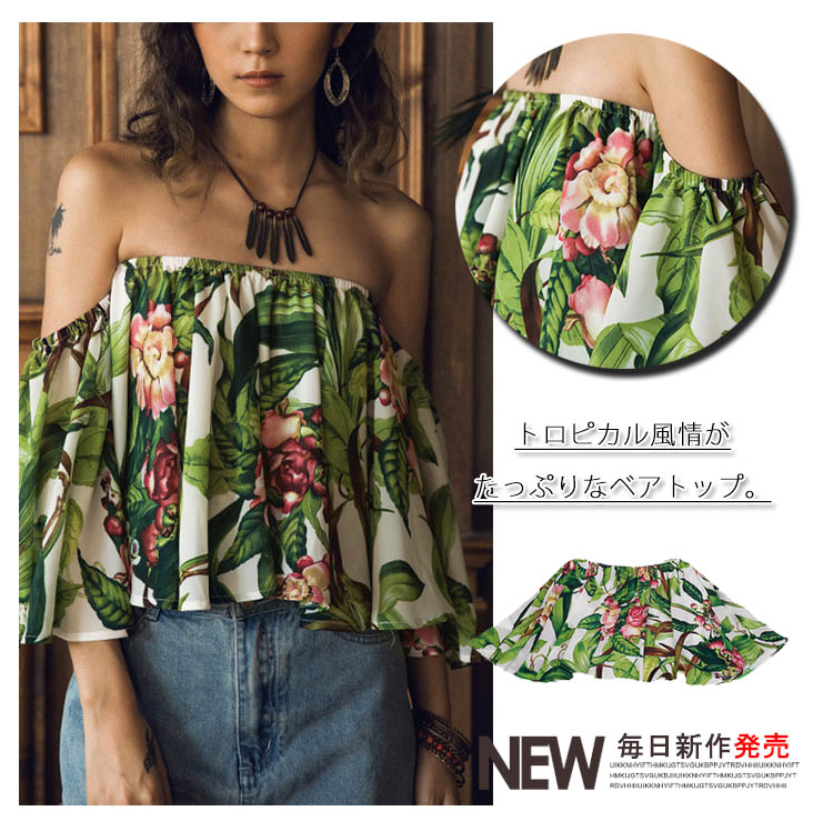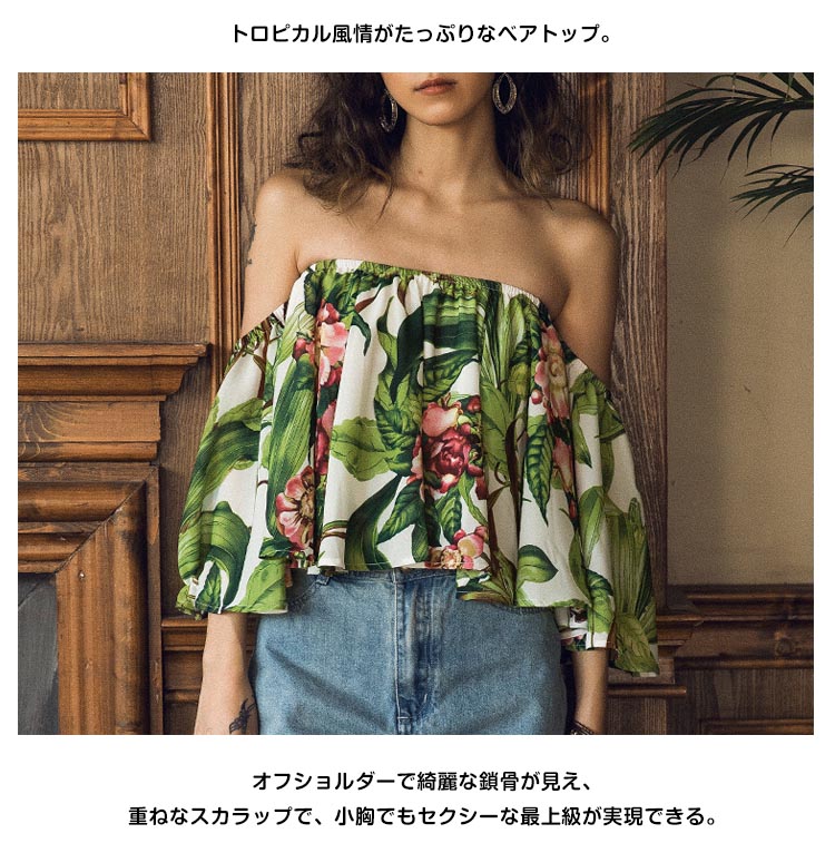 | トロピカル風情がたっぷりなベアトップ。オフショルダーで綺麗な鎖骨が見え、重ねなスカラップで、小胸でもセクシーな最上級が実現できる。ゴムで、スカラップを丸くするデザイン、ふんわりになって、動感美を満たす。清々しい花柄プリント、キュートで活発ない印象に注目され。普段着なのにどこかオシャレな雰囲気を演出している。 | |