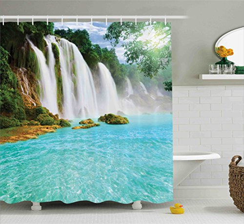Ambesonne Waterfall Decor Collection, Ban Gioc- Detian Waterfall Forest Tropical Waterscape Clear Pool Picture, Polyester Fabric Bathroom Shower Curtain Set with Hooks, 84 Inches Extra Long, Turquoise