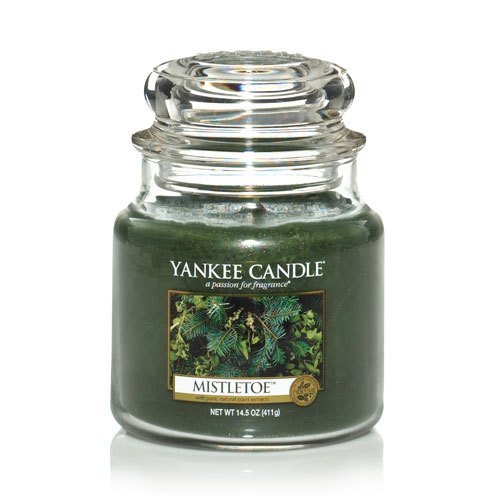 -. Binding : Kitchen -. Brand : Yankee Candle Company -. Color : medium green -. Department : unisex-adult -. EAN : 0609032102227 -. Feature : Top Note: Green Aromatic. Top is the initial impression of the fragrance. / Mid Note: Fresh Pine Needle, Bark. Middle is the main body of the scent. / Base Note: Sweet Clove and Spice. Base is its final impression. / Lead-free, 100% natural fibers, and hand straightened to ensure it is centered for the best burn possible. / Burn Time: 65 to 75 hours -. IsAutographed : 0 -. Label : Yankee Candle Company -. Manufacturer : Yankee Candle Company -. Model : 8460 -. MPN : 1003319 -. NumberOfItems : 1 -. PackageQuantity : 1 -. PartNumber : 1003319 -. ProductGroup : Home -. ProductTypeName : HOME -. Publisher : Yankee Candle Company -. Size : 14.5 oz -. Studio : Yankee Candle Company -. Title : Yankee Candle® 14.5 oz Medium Jar - Mistletoe -. UPC : 609032102227