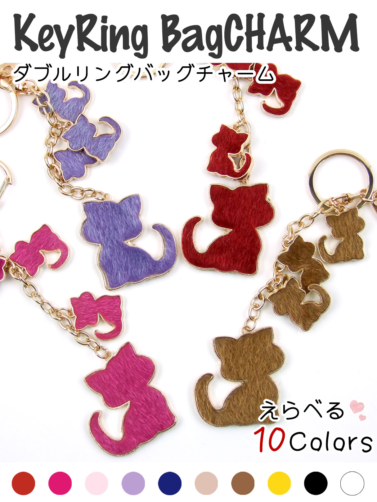 【かわいいバッグチャームが入荷!】ゴールドフレームが可愛い親子ネコのバッグチャームで選べる全10カラー!フラットで高級感のあるPUレザーの親猫と3連子猫がとてもキュート。さりげないボリューム感で、どんなバッグにも合いやすいスマートなデザイン!親猫と3連子猫がゆらゆら揺れるかわいいチャームキーホルダー。バッグだけでなくスマホケースや鍵にもつけられるのでとても便利です!豊富なカラーバリエーションで簡単なお土産などにもピッタリですね。