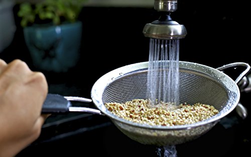 Stop watching your food go down the drain! Our very fine wire mesh strainer is designed to strain the smallest ingredients, such as quinoa, orzo, couscous, and farina. Guaranteed to never lose a grain or your money back! See how well our mesh holds quinoa in the 3rd image above!