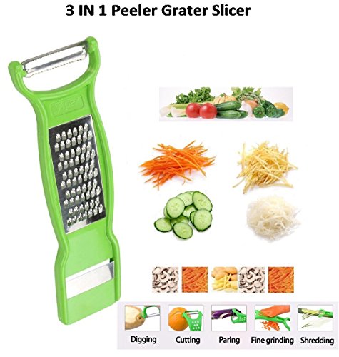 - 3 functions 1 Product. It can be used as peeler: Peels Fruits and vegetables. Grater: grates Cheese, vegetables and fruits. Slicer: slices vegetable, dry fruits etc.