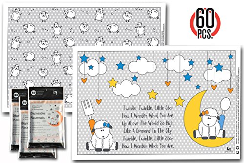 HAVE YOU NOTICED? No other brands offer 2 individually folded patterns in one pack. Our bundle pack includes 3 stylish RESEALABLE Zip lock bag and each bag includes 20 placemats (10 x Baa Baa Black Sheep and 10 x Twinkle Twinkle Little Star). In total, the bundle offer contains 3 bags giving you 60 counts of placemats. We kept each mat individually folded in each bag for your convenience, so that you can pull each placemat out easily.
