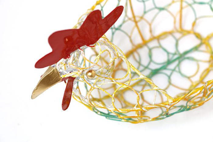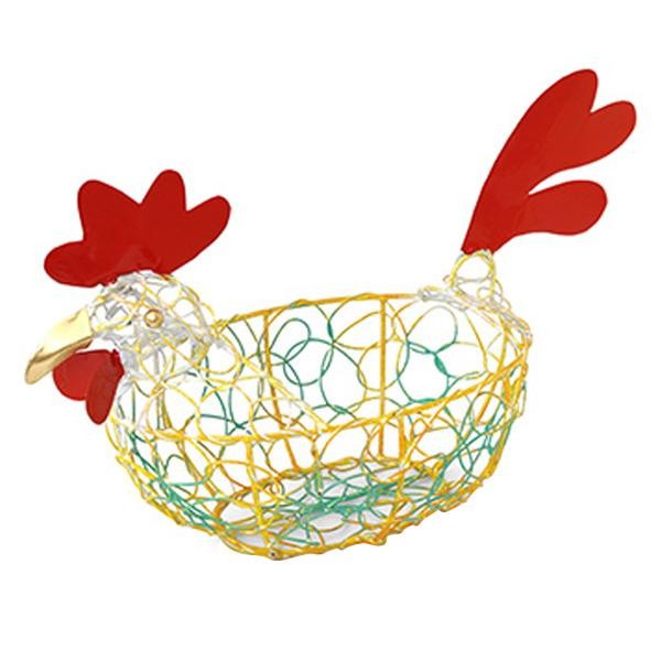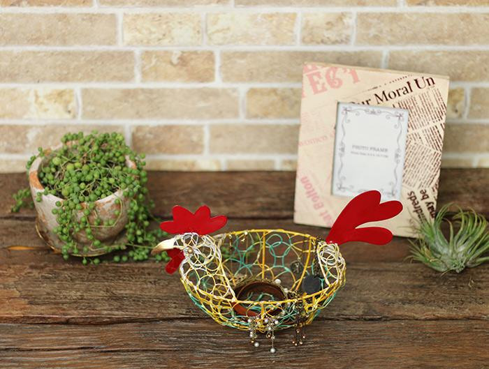 ブリキの針金状にして編み込んだ、真っ赤なトサカがかわいいニワトリ型のバスケット。ちょっとした小物入れにどうぞ。