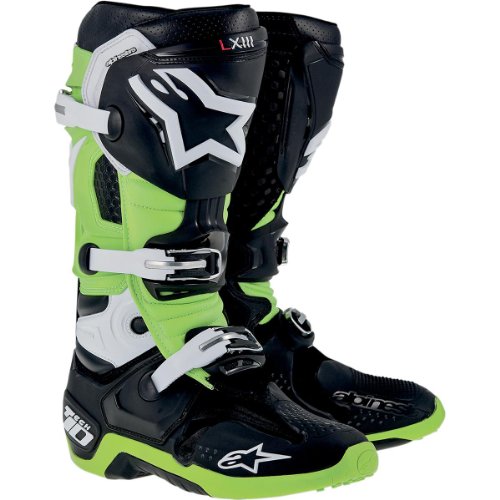 Studio : Alpinestars Publisher : Alpinestars Binding : Misc. Product Description Primary Color: Green Size: 9 Distinct Name: Black/Green Gender: Mens/Unisex Our most innovative off-road boot design yet Revolutionary external structure features an ultra low-profile design to minimize weight at the lower section of the boot Boot upper is designed for controlled flexibility, streamlined profile and superior grip against the bike Innovative bio-mechanical inner bootie provides the ultimate in support Replaceable torsion bars help control ankle and leg rotation while allowing freedom of movement Heel and ankle feature PU protection and shock-absorbing padding Ultrathin and flexible forefoot area for increased feel at the controls Inner bootie is washable and replaceable Boot upper is combination of full-grain leather and impact- and abrasion-resistant PU shell PU toe, foot, heel, ankle, calf and shin PU guards with extra-hard compounds on the toe box, heel and Achilles tendon Innovative PU spine protects heel, controls flex and features a hyperextension guard Boot outer side features anti-torsion PU panel on the ankle for flexibility and support Ultra-comfortable, precision-fit interior uses a new poly fabric lining with open-cell foam and a shock-absorbing shin pad New, exclusive dual-compound sole is seamlessly integrated to the multi-density foot base structure with built-in support Sole provides superior durability, grip, feel and a high level of structural integrity Advanced boot closure system features three techno-polymer and aluminum buckles for easy adjustability and a precise, secure and streamlined fit Buckles feature memory, quick-release/locking system and a self-aligning design for ease of use Three-buckle system works in conjunction with the entire boot internal structure to provide excellent support and flexibility Inner side of boot features PU panels for heat and abrasion resistance Form-fitting PU gasket seals water out of the boot